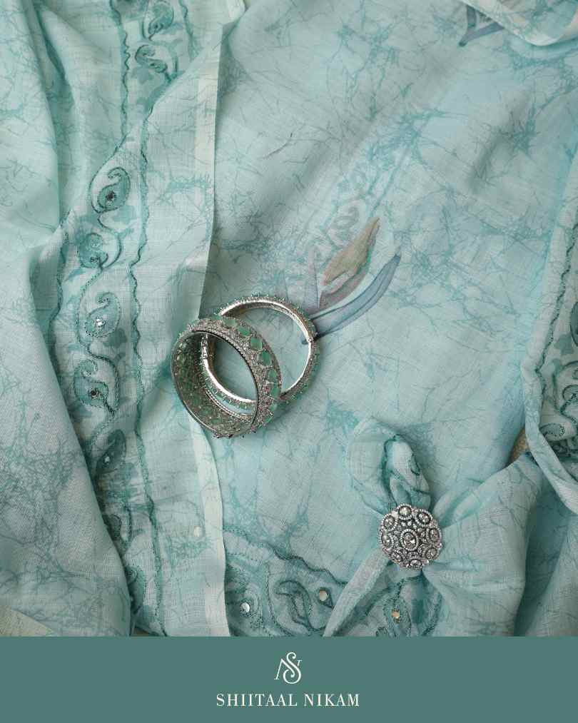 Crafted in soft cotton linen, the kurta features delicate digital prints blended with subtle embroidery and shimmering abla (mirror) work that adds just the right touch of sparkle.