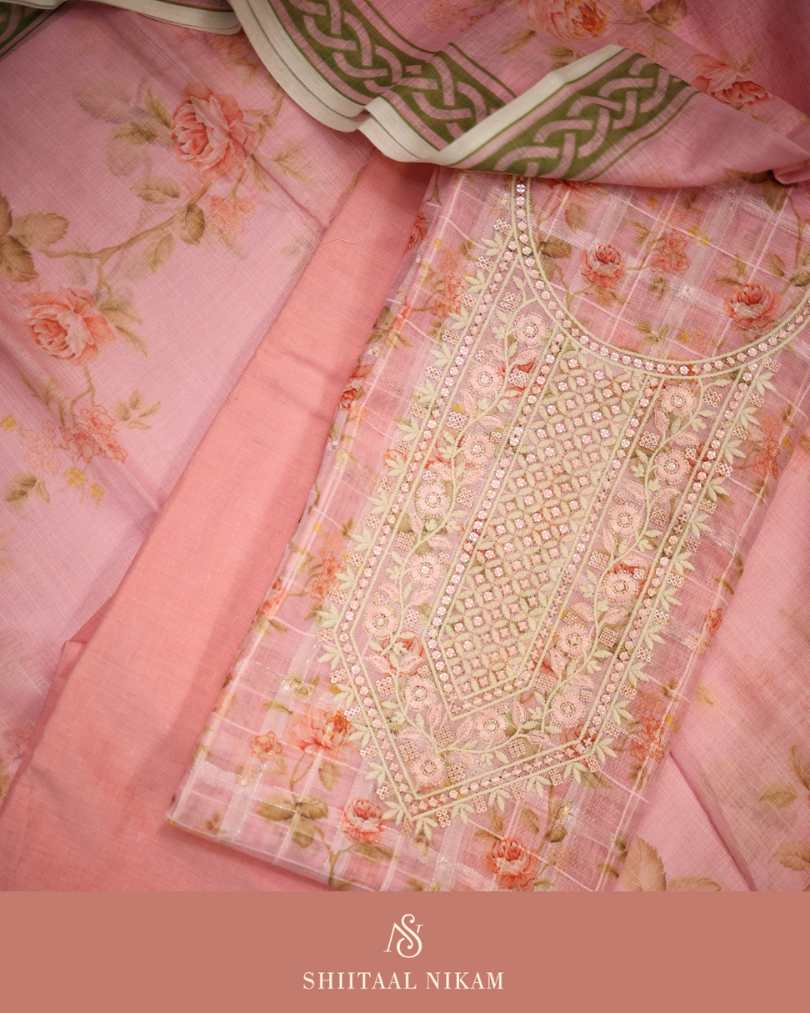 A dreamy pink linen kurta and dupatta with soft floral prints and delicate thread embroidery, paired with a breathable cotton pant. Light, graceful, and perfect for daytime outings or summer gatherings.